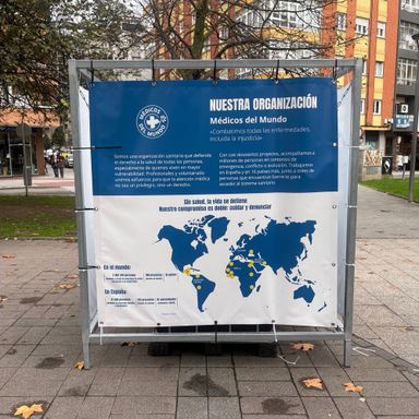 Imagen claramente identificable, que enmarca como si de una obra de arte se tratara, el logotipo de Médicos del Mundo. Metáfora visual precisa y limpia que resalta y da fuerza al mensaje.