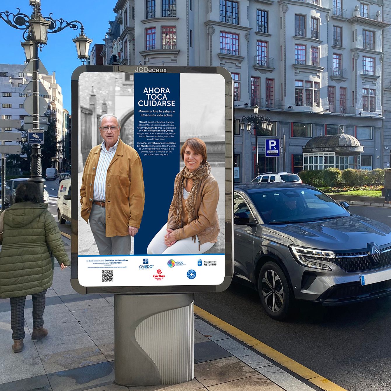El protagonismo de la campaña lo asumieron personajes reales, con nombres y apellidos, que son voluntarios de distintas ONG’s fotografiados en espacios fácilmente reconocibles de Oviedo, para animar a los mayores de 65 años a llevar una vida activa y de compromiso, con un eslógan coloquial, con un doble sentido: el cuidado a los demás y el cuidado a uno mismo en el tiempo de jubilación.