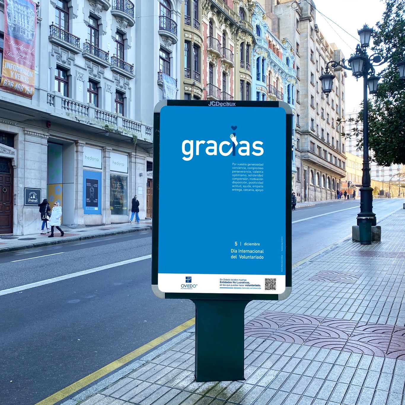 Optar por la sencillez expresiva y visual al hacer de la palabra «gracias» el centro de atención del diseño, con los colores identificativos de la ciudad de Oviedo (azul y blanco) y con dos símbolos que hablan por si solos: un corazón y una «c» que se extiende y forma una mano que abraza y acompaña, mostrando el nivel de generosidad y entrega que hace del voluntariado, una pieza indispensable en nuestra sociedad.